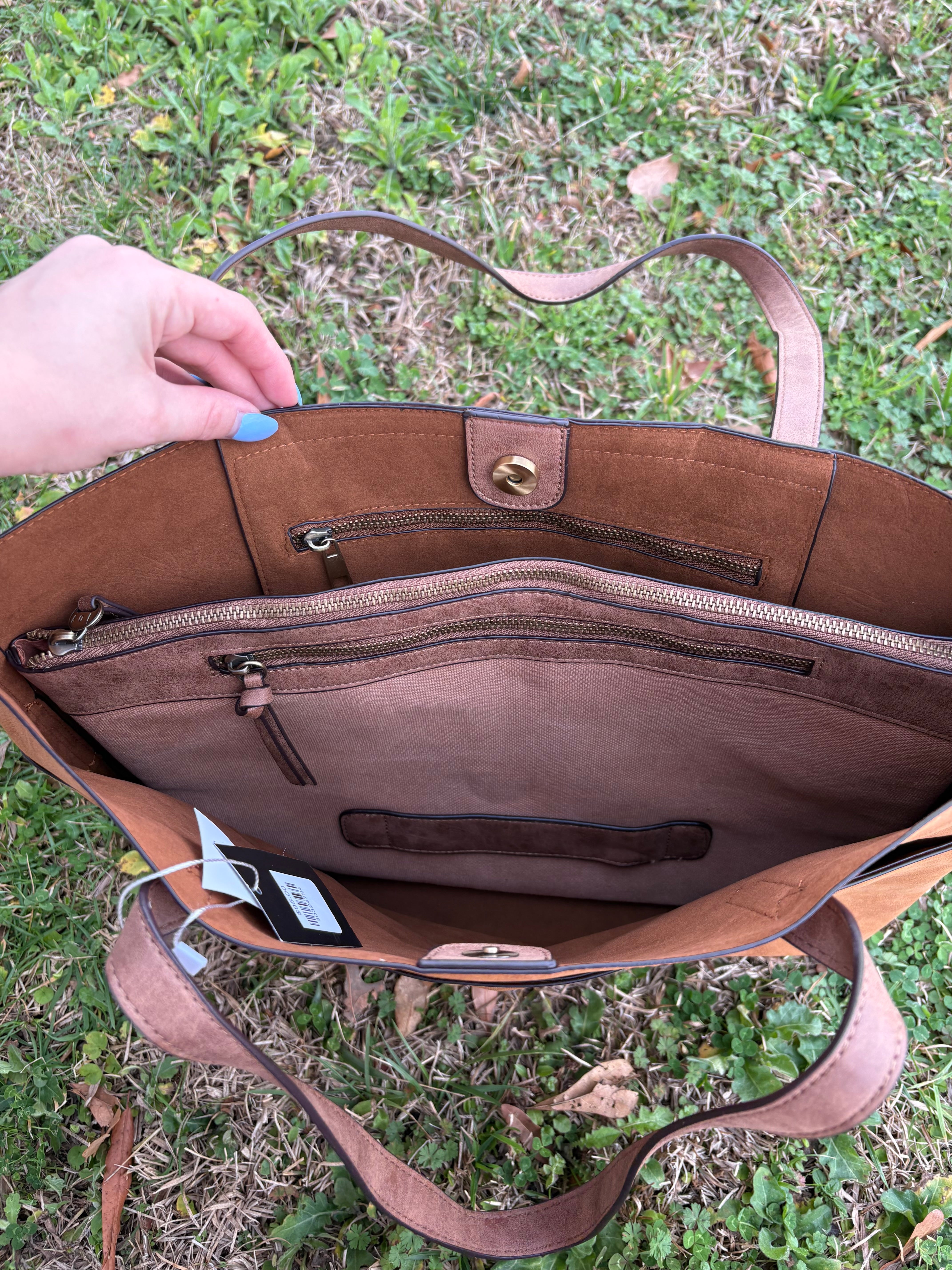 Two bags in one, featuring a roomy tote and a removable laptop sleeve that nestles securely inside this office friendly tote. The tote is crafted in soft earth friendly vegan suede in gorgeous shades for year-round wear with neutral light brown vegan leather trim. As an added Bonus, the padded, removable laptop sleeve fits up to a 17” laptop or tablet and is made in soft washed canvas with also with neutral light brown vegan leather trim. The top zip closure on the laptop sleeve is accented by our signature Joy Susan Logo zip pull. Protect your laptop and elevate your work week’s look with this beautiful tote.