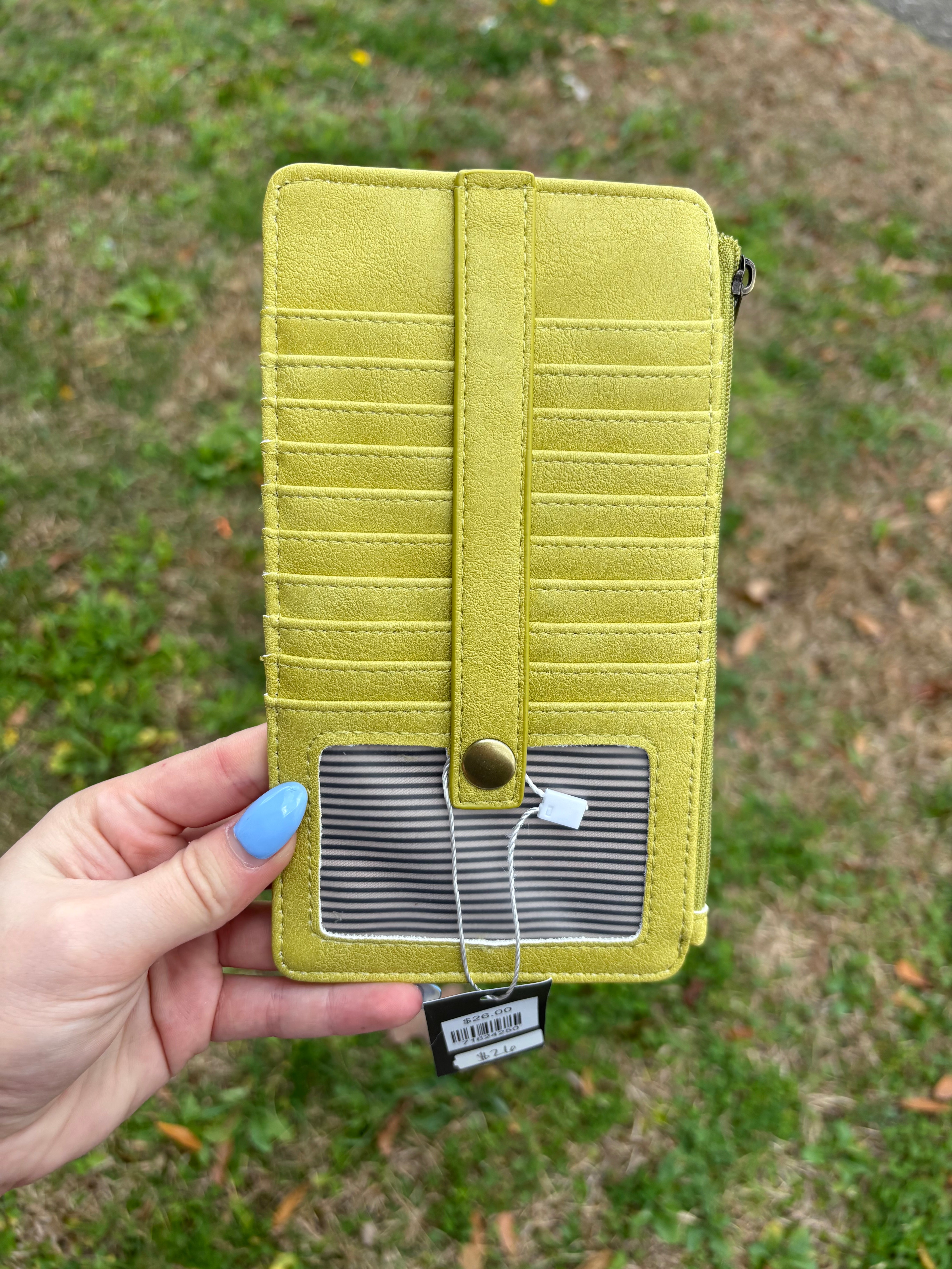This slim and sleek card wallet has 9 credit card pockets, an ID window, zippered change pocket and zippered billfold pocket all in casual distressed Vegan Leather