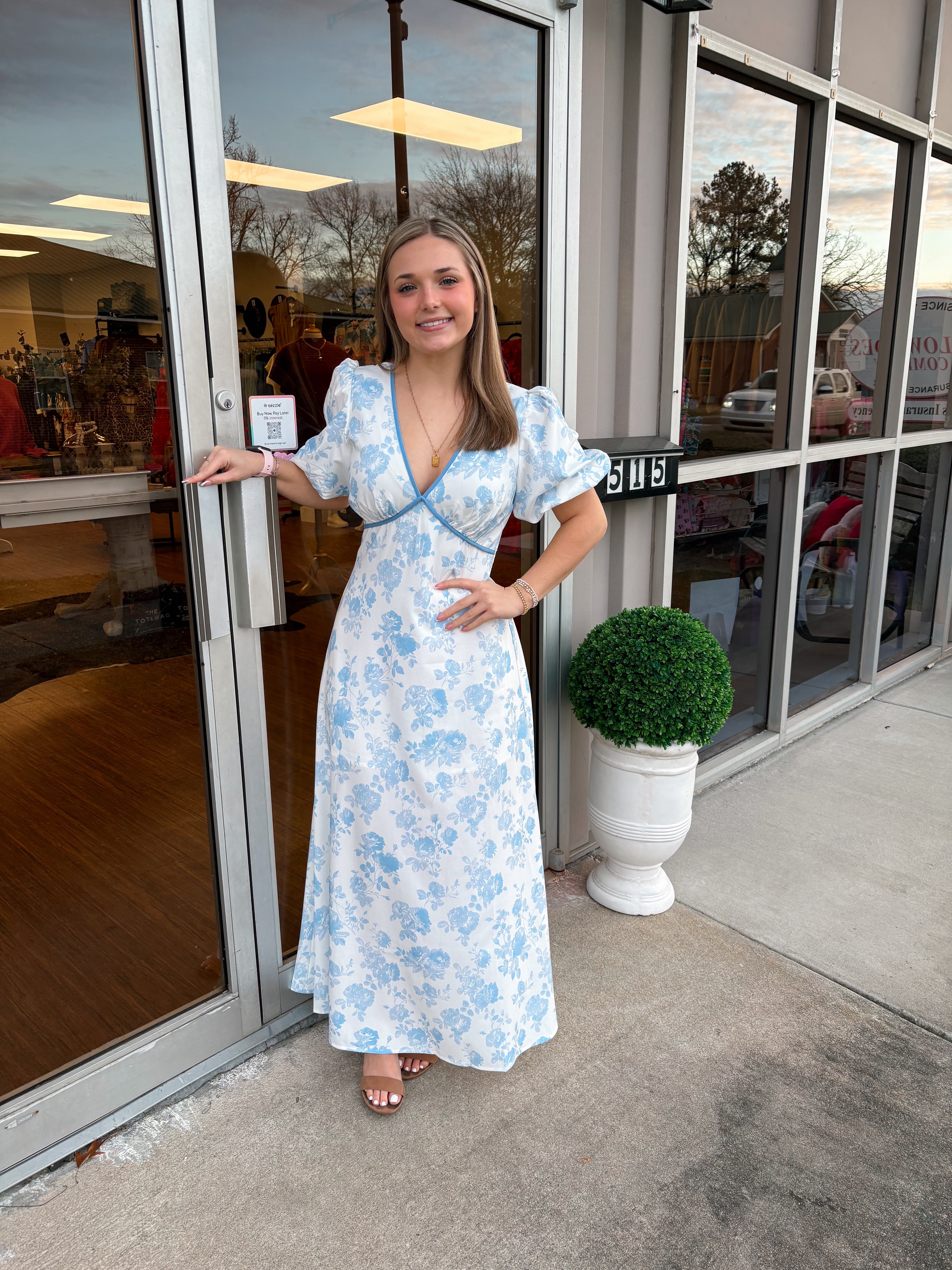 floral maxi dress, toile print dress, bubble sleeve dress, contrast binding dress, feminine maxi dress, empire waist dress, romantic floral outfit, lightweight summer dress, garden party style, vintage inspired dress