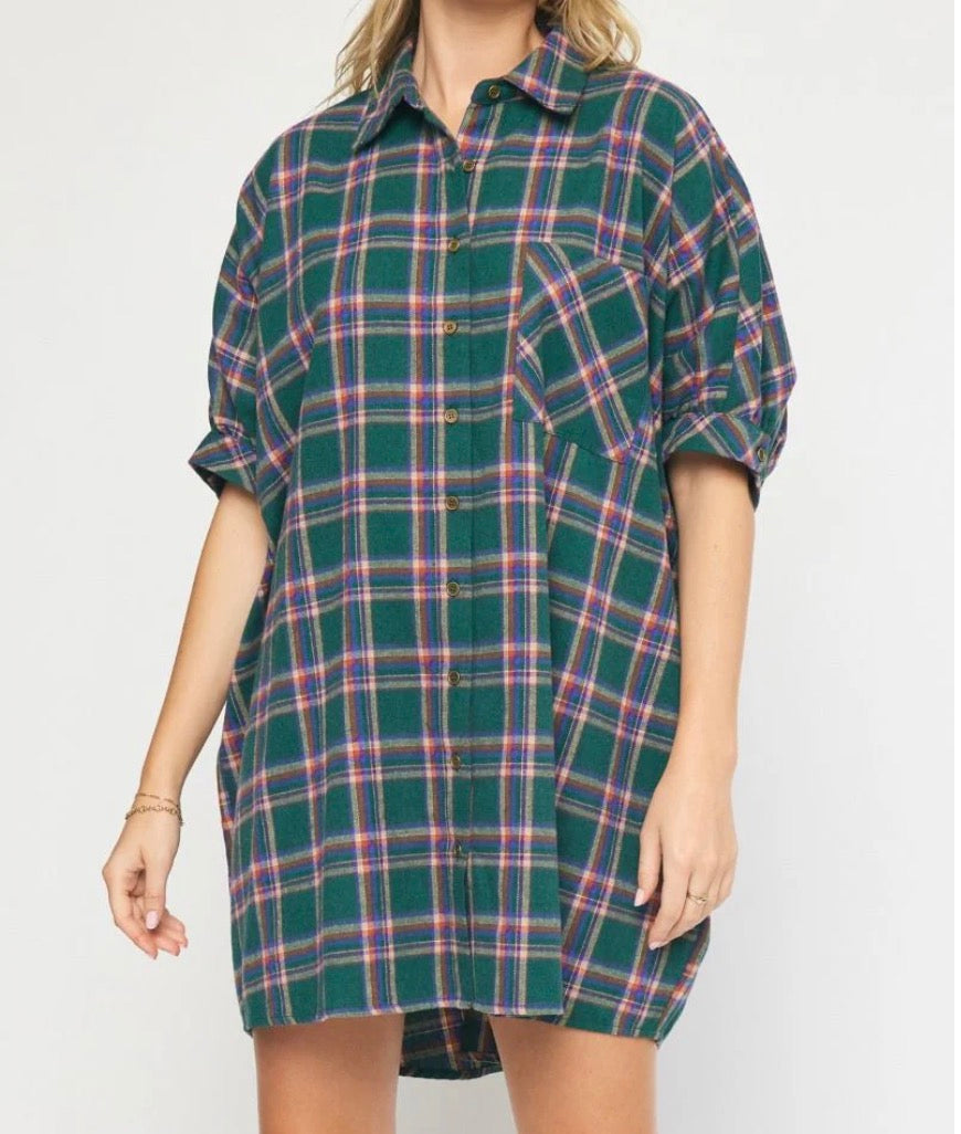 This tunic dress is made for you! So cute and comfy! Oversized fit, short sleeve style. Pair with booties or sneakers and you are mad for plaid!!