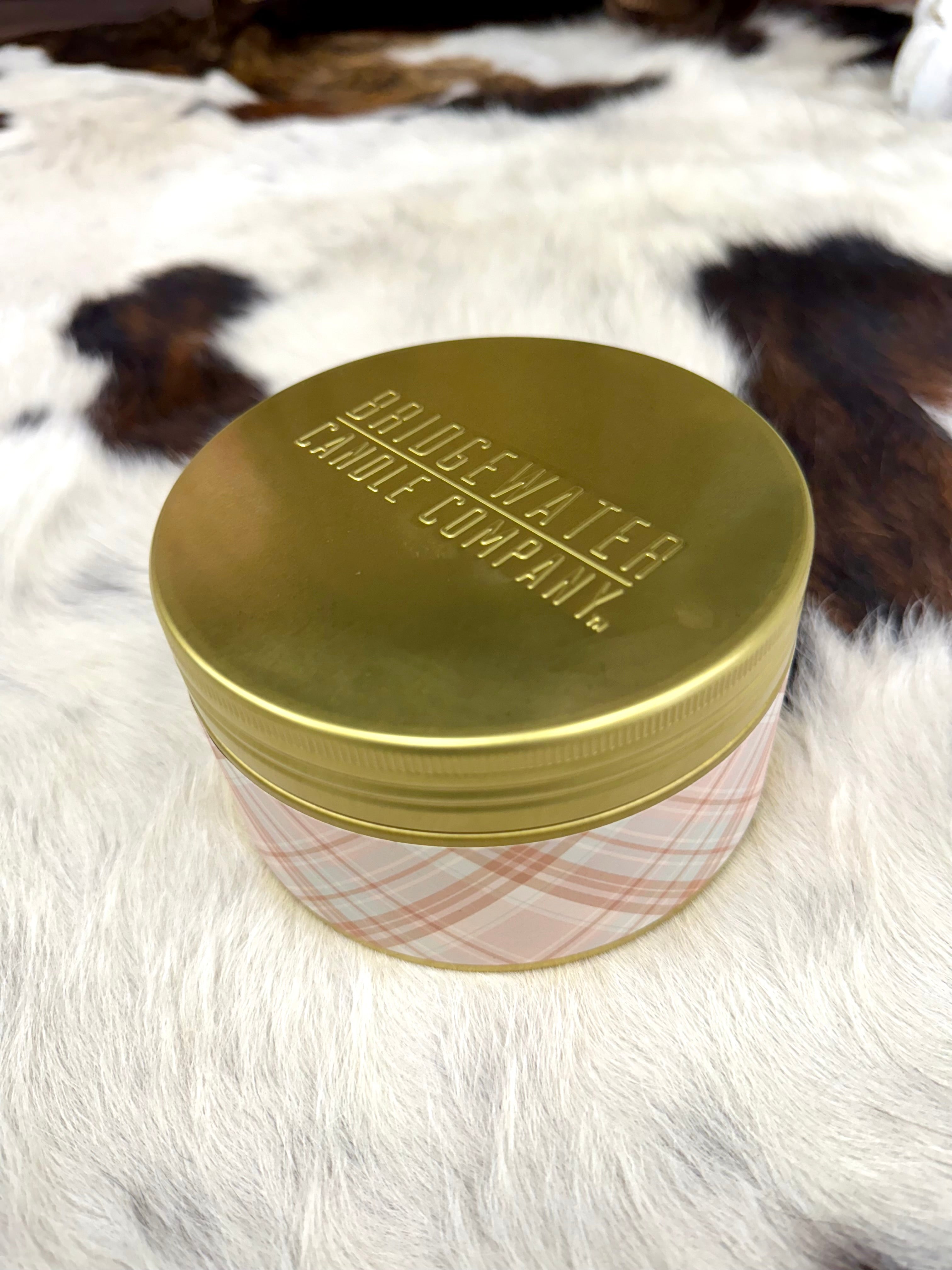 Elevate your home's ambiance with the 3-Wick Candle, nestled in a charming round tin boasting a luxurious gold finish. Adorned with a classic plaid-wrapped label, this candle adds a touch of charm to any space. With three wicks and a 24-hour burn time, enjoy the warm glow and subtle fragrance as you create cozy memories.