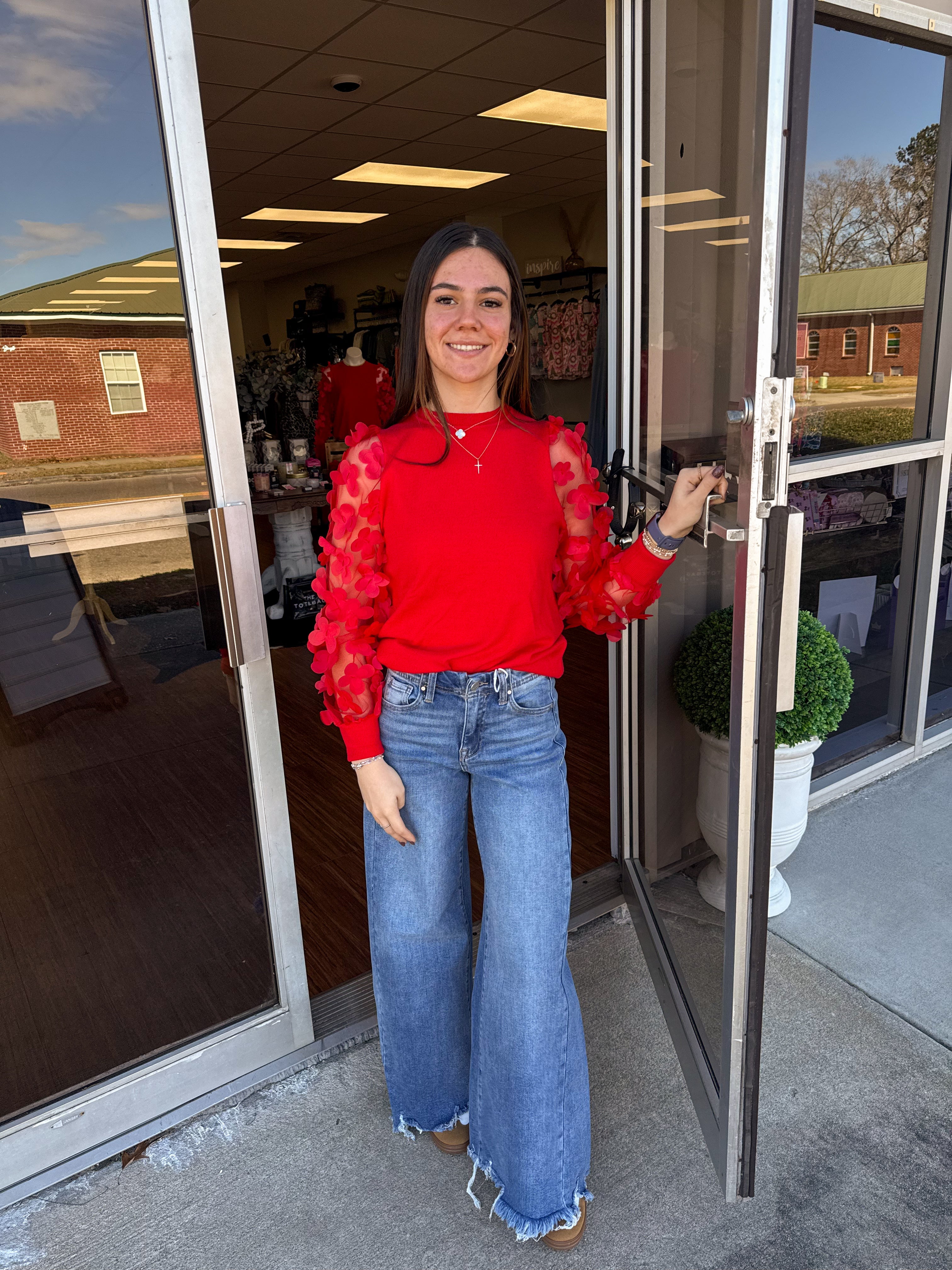 - Ribbed Crew neck - Soft, Thin body sweater top - Puff long-sleeves - Organza flower with ribbed hem - Elegance Style - Lightweight and breathable 80% Viscose 20% Nylon