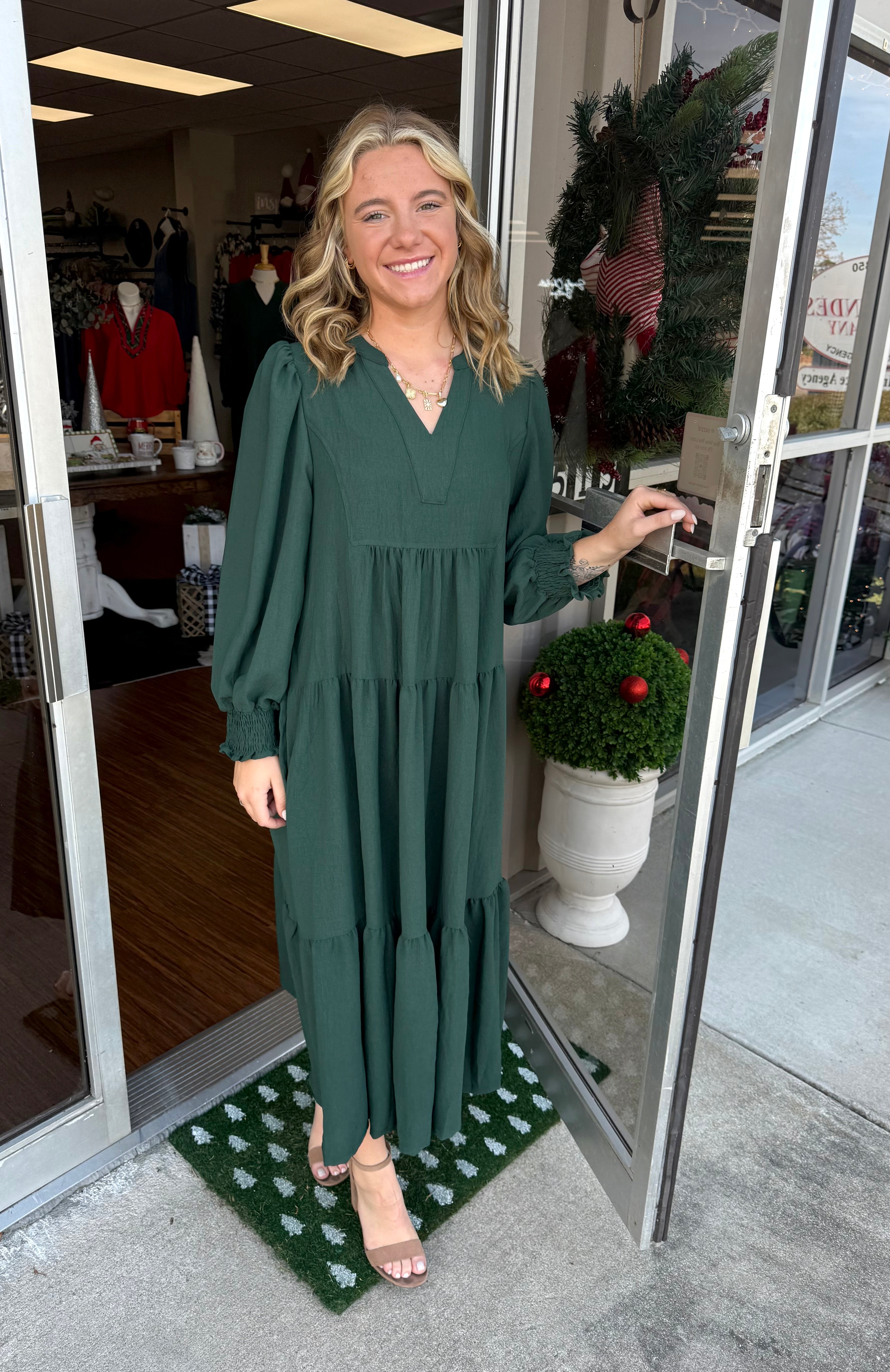This dress is so effortlessly elegant , you'll reach for it season after season. Designed with a flow tiered silhouette and soft, lightweight fabric, it flatters without feeling fussy. Side pockets keep it functional, while the split neckline and ruffled sleeve cuffs add a touch of romance. Perfect for both workdays and evenings out, this dress moves easily from desk to dinner!