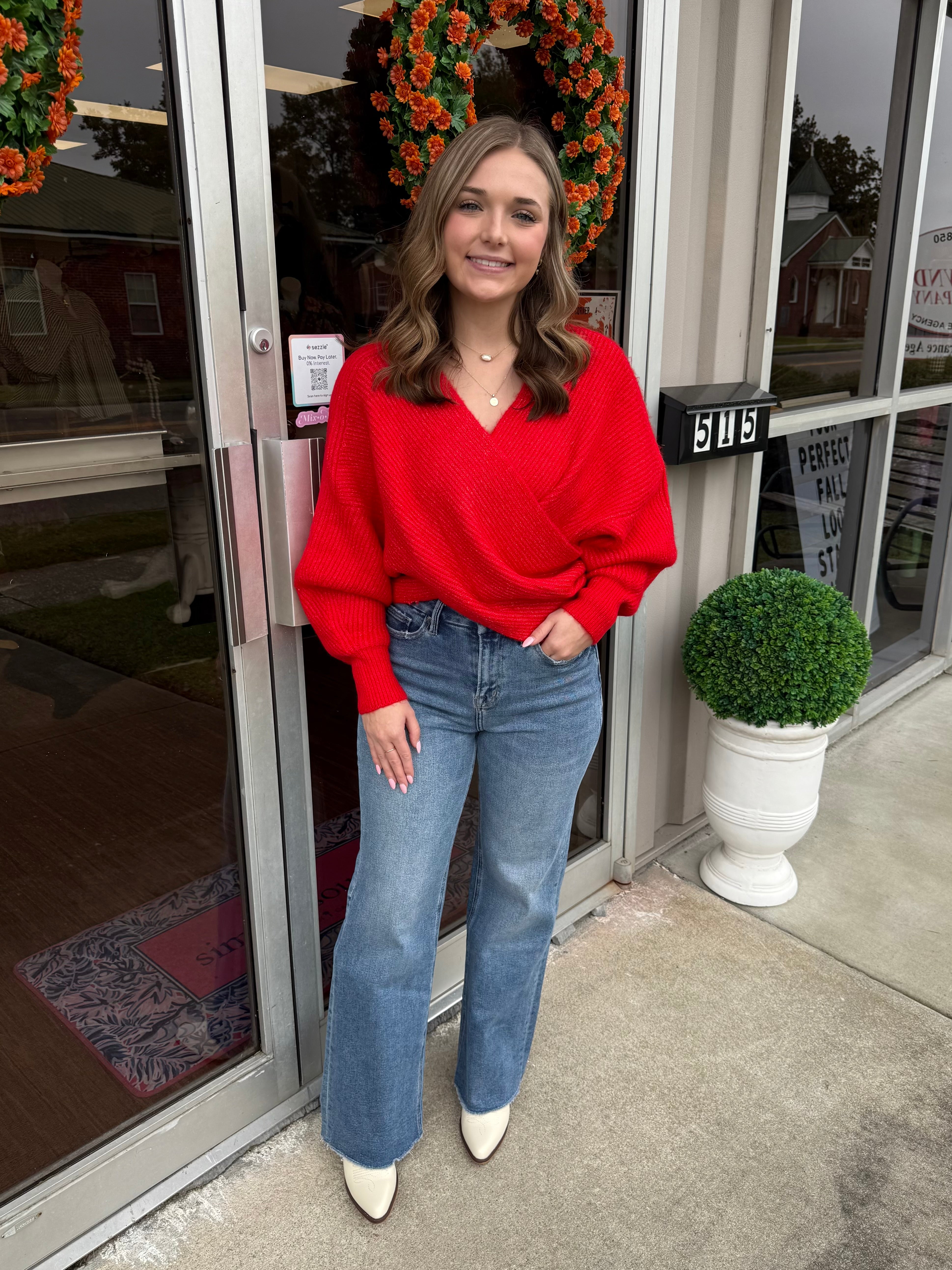 This effortlessly chic and cozy sweater, crafted from a soft and fuzzy knit is designed for both comfort and sophisticated style. It features an elegant surplice or wrap-front design that creates a flattering V-neckline, which is wide enough to be styled alluringly off the shoulder. The relaxed, slightly cropped silhouette is enhanced by voluminous dolman sleeves that taper into fitted ribbed cuffs, adding a touch of modern drama to this versatile and inviting piece.