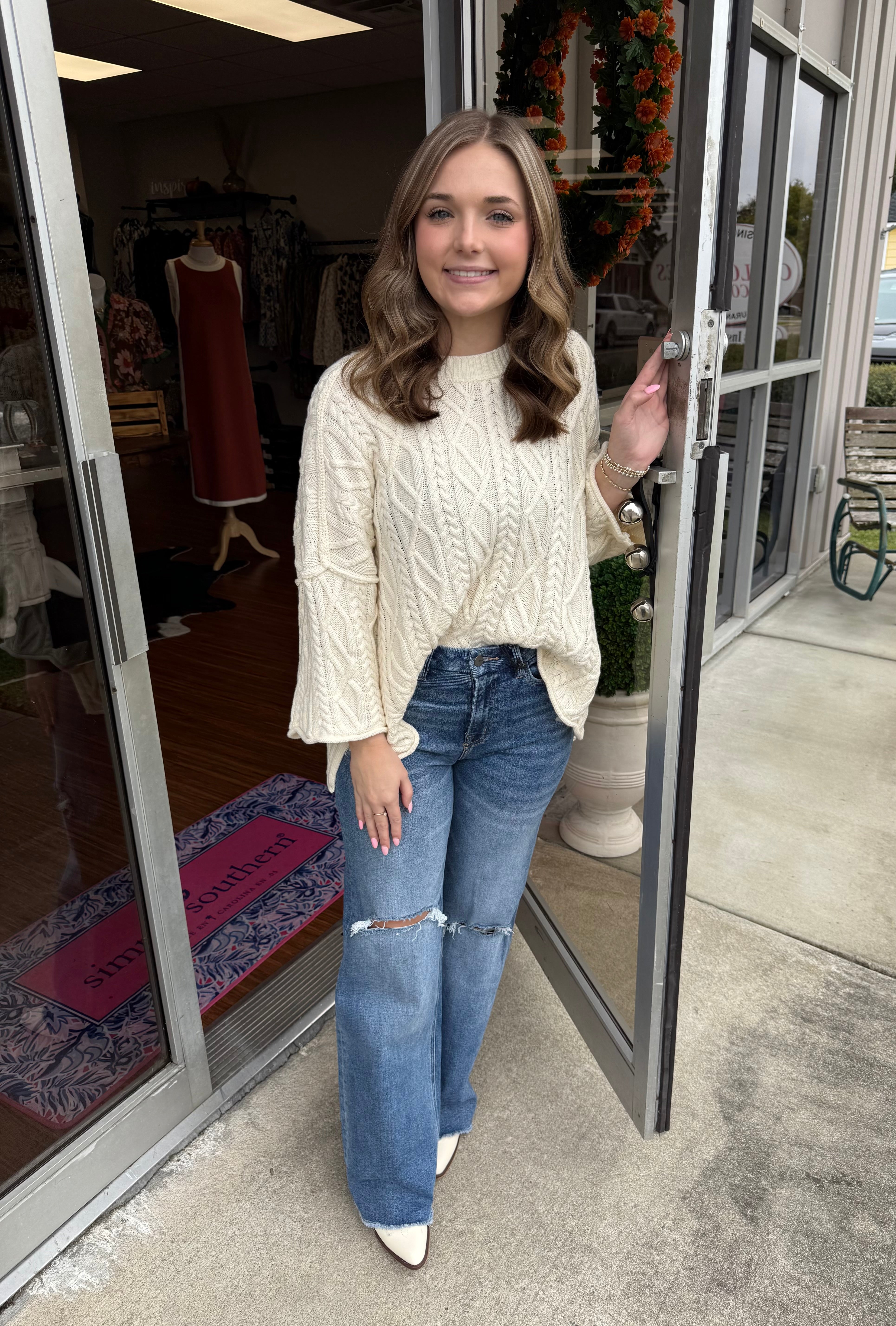 This beautifully crafted sweater is a cozy and stylish take on a timeless classic. It boasts a rich, all-over cable knit design with a complex mix of braids and diamond patterns that create stunning texture and depth. The relaxed silhouette is complemented by dropped shoulders and chic three-quarter length sleeves that flare out into a gentle bell shape. A final touch of unique charm is added with a delicate scalloped hem, making this sweater a perfect blend of traditional craftsmanship and modern, bohemian style.