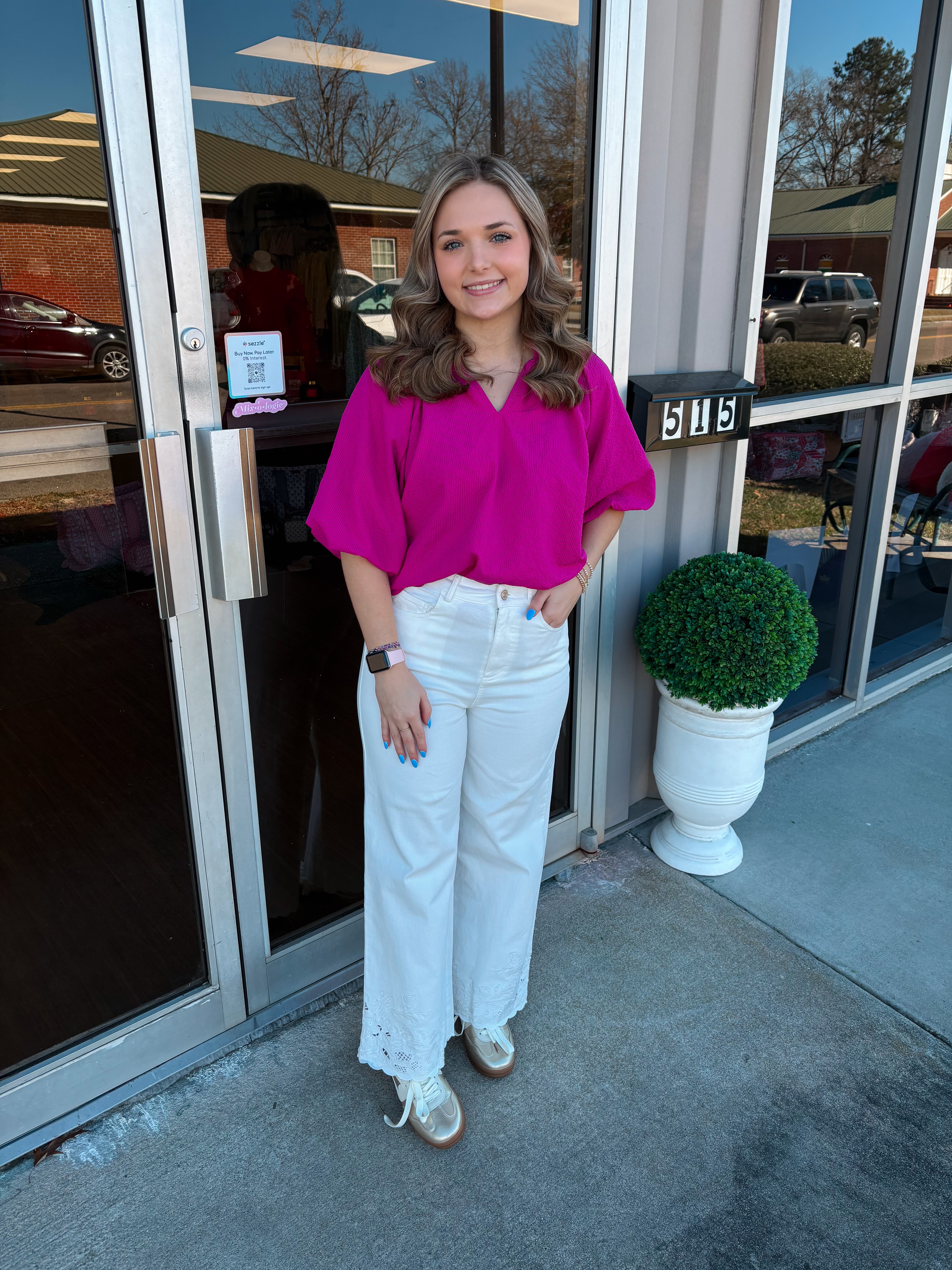 Indulge in luxury with this in this springy magenta hue. Made with crinkle seersucker material, this top features a unique bubbled sleeve design, a scalloped hemline and collar for a perfectly elevated and sophisticated look. Embrace the art of fashion with this exclusive piece.