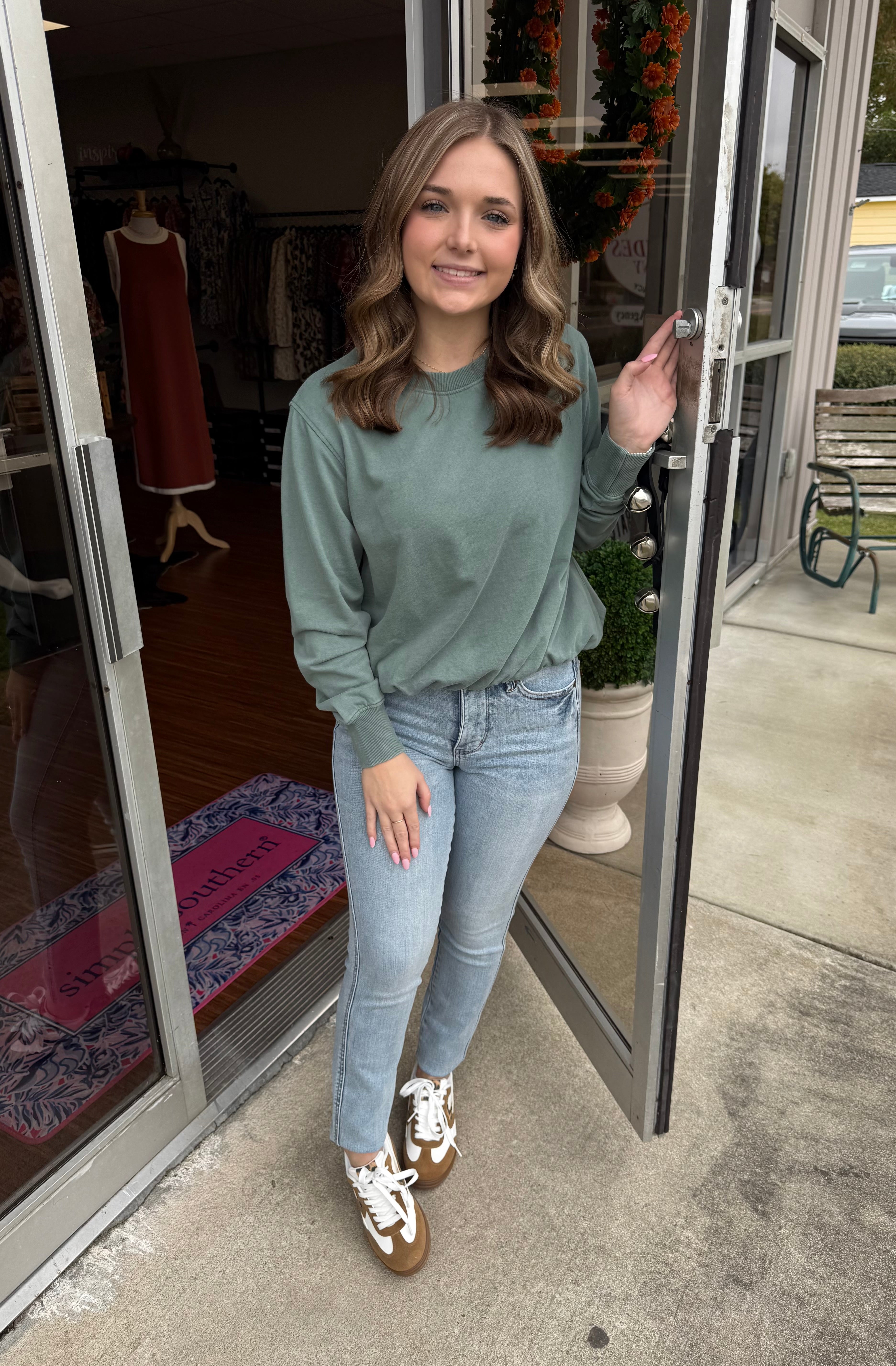 Made from soft cotton with a cozy fleece interior, this pullover sweater features a unique bubble hem for a subtle cinched silhouette. Finished with a vintage-inspired mineral wash and ribbed collar and cuffs, it blends comfort and character in one effortlessly cool layer.