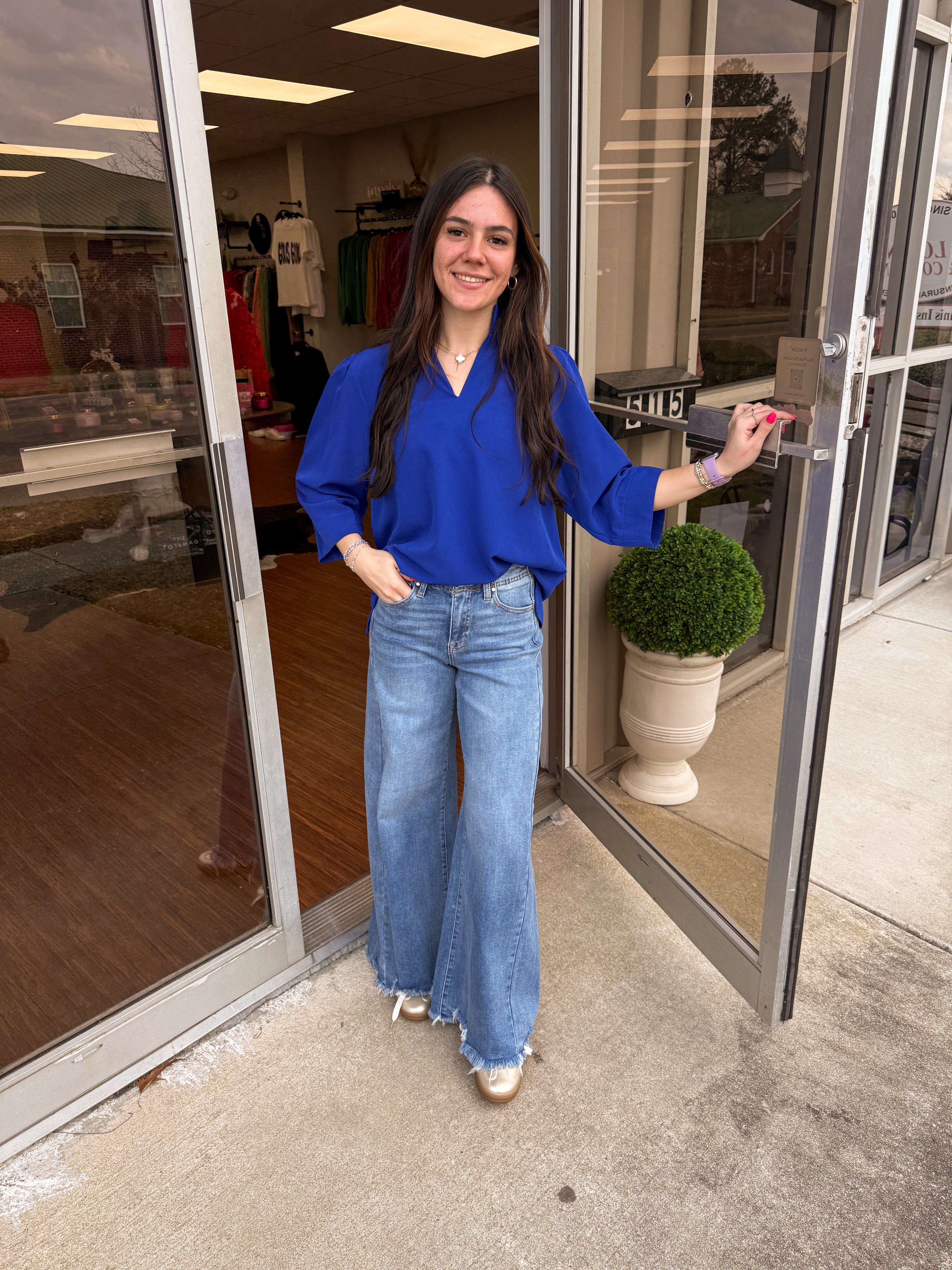Elevate your style with this perfect top. Featuring 3/4 sleeves with a ruffled neckline and side slit hem, its crafted for a light, breathable feel. Pair with your favorite denim for an effortless outfit!