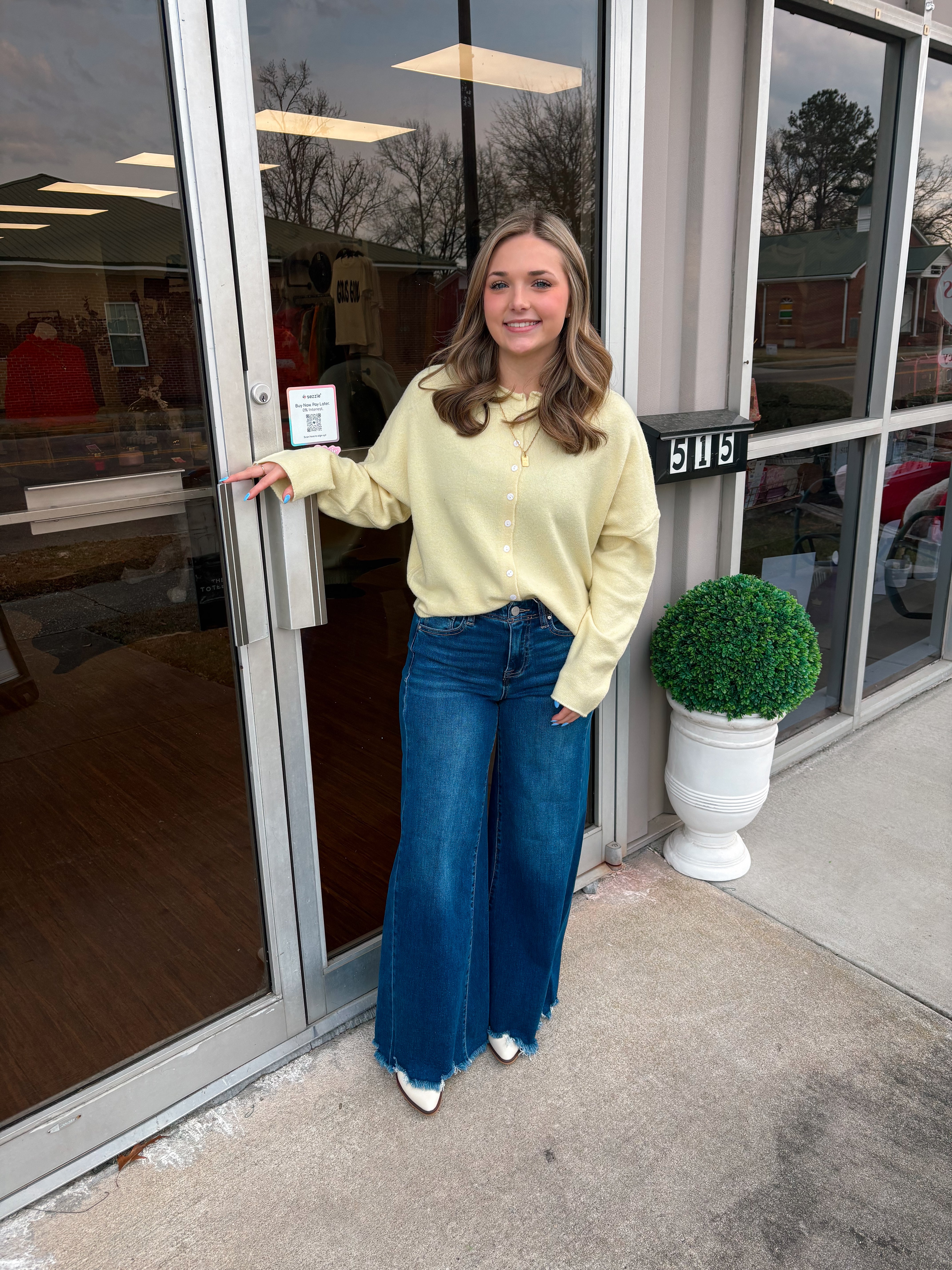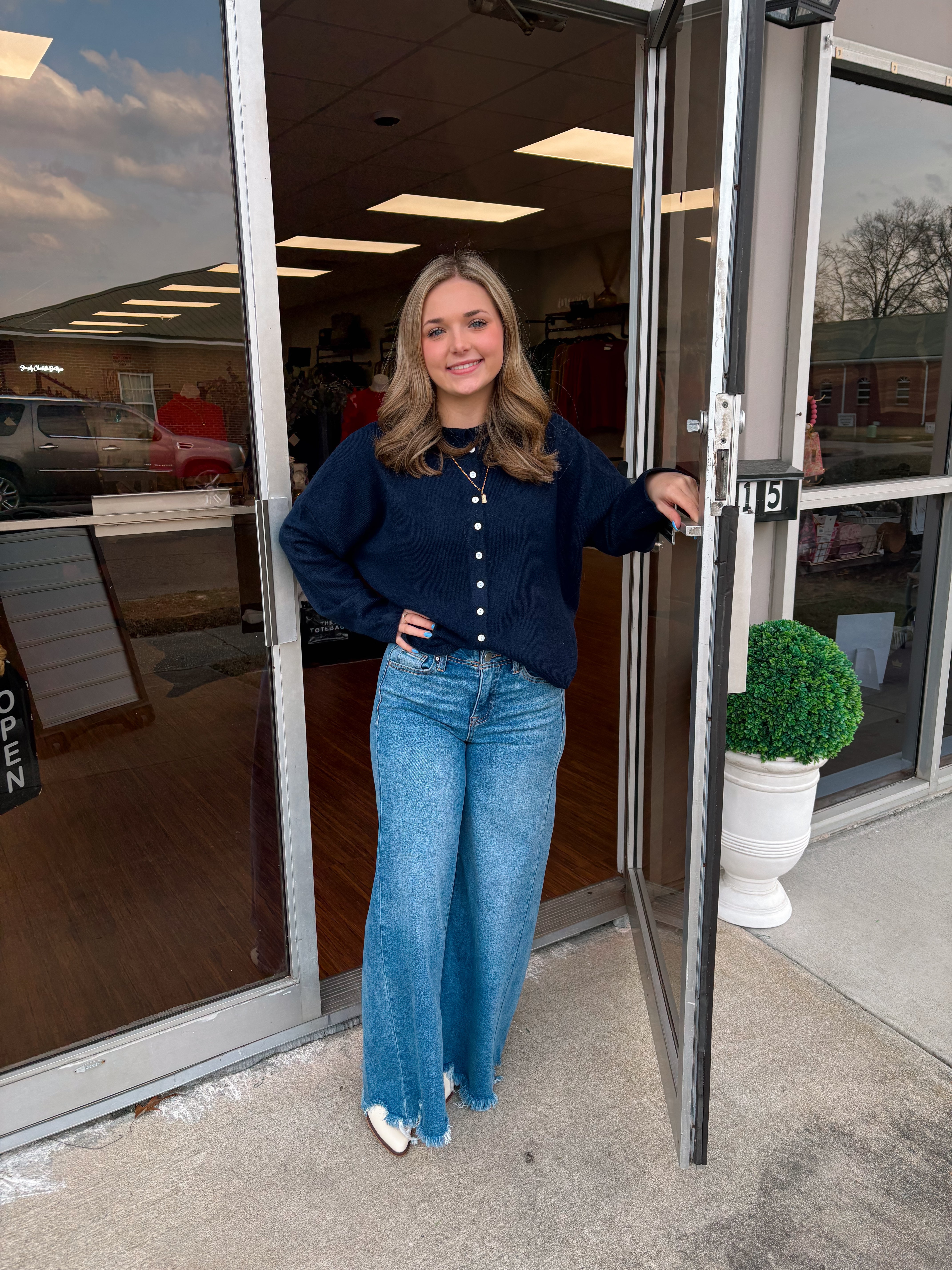 This soft knit button front cardigan features a relaxed drop shoulder silhouette, ribbed hem and cuffs, and a crew neckline that rolls down into a subtle collar like finish for a cozy yet polished look.