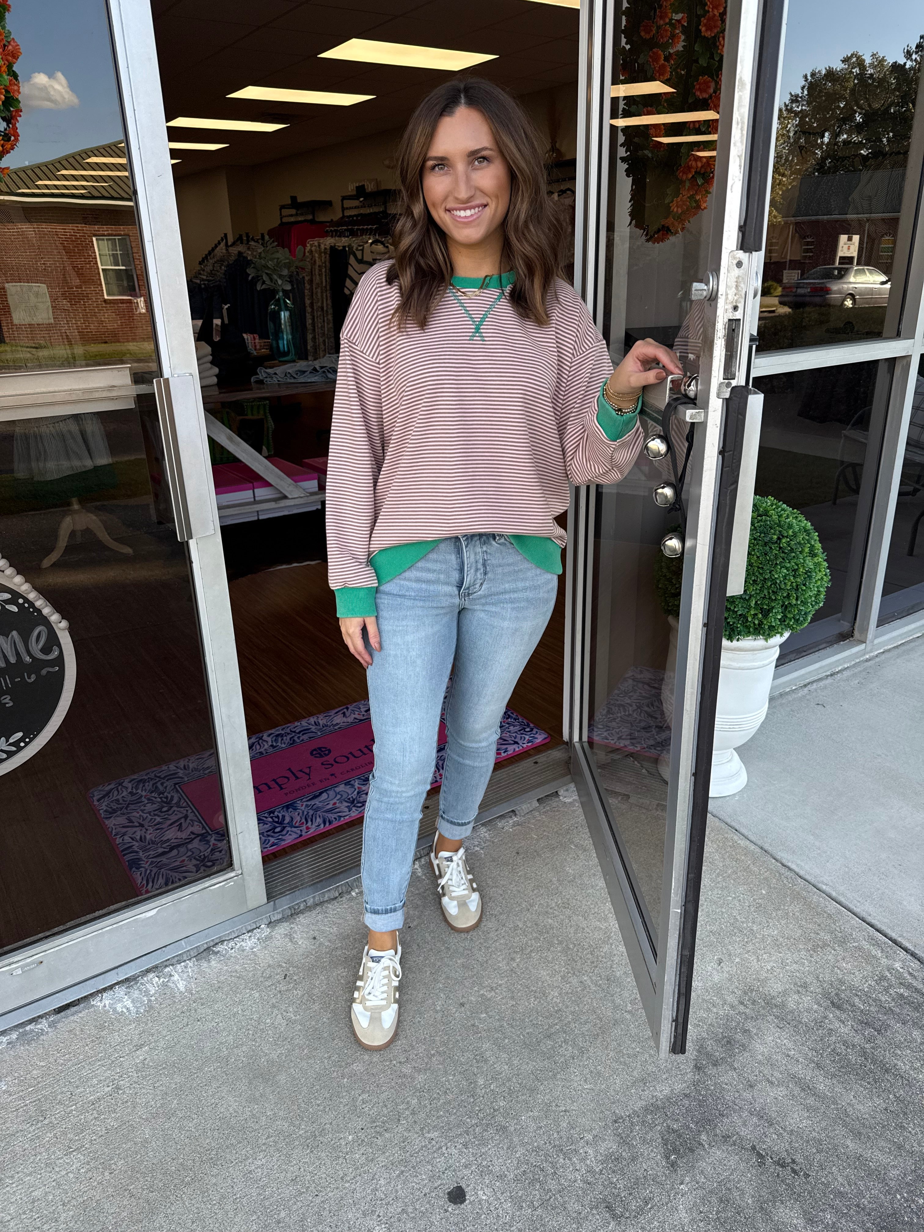 Stripes never go out of fashion! This top features a solid pop of color trim that pops against the striped body!
