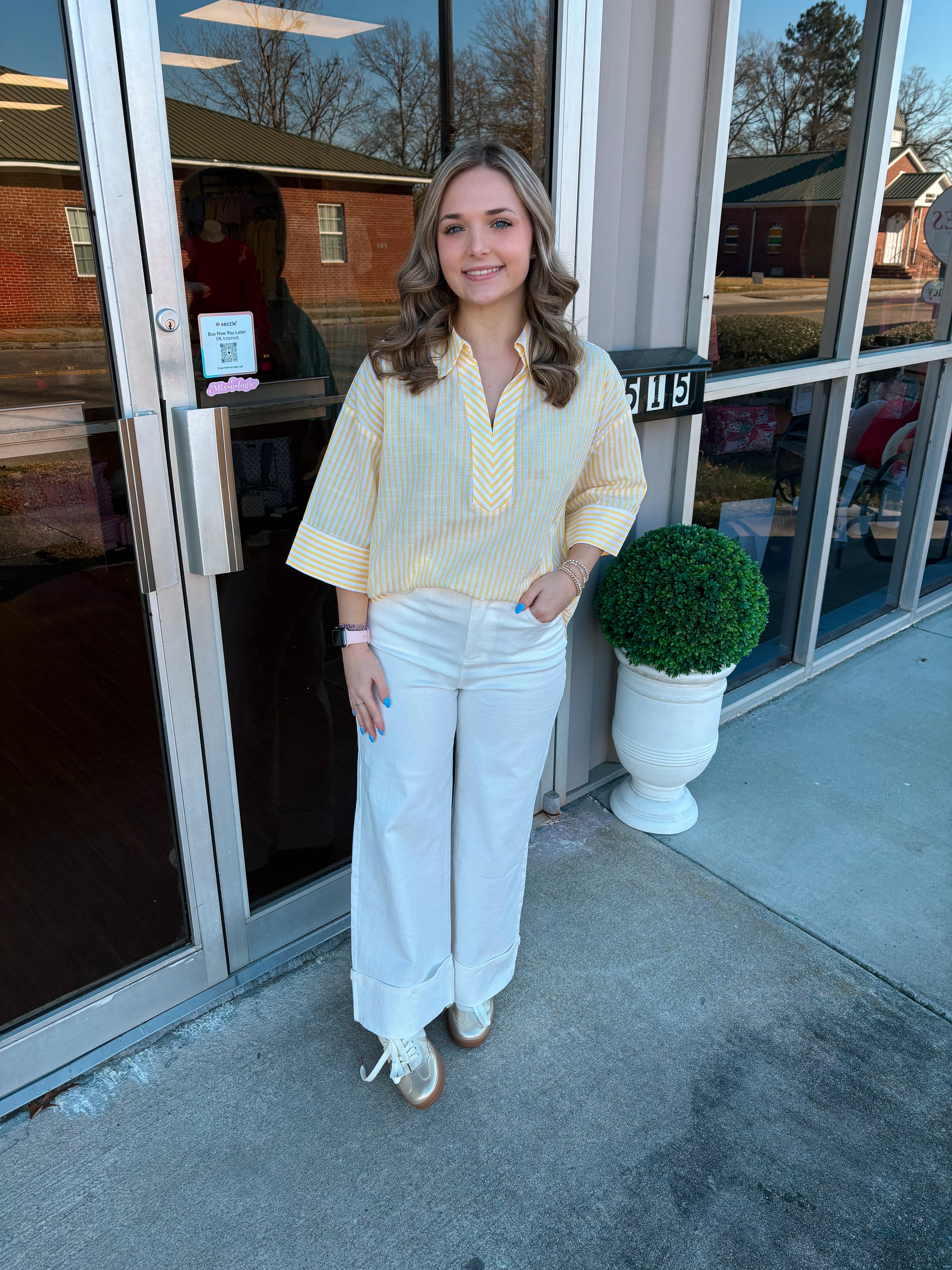 Brighten up your wardrobe with this effortlessly chic top. Crafted to bring a pop of cheerful color to any wardrobe, this top combines classic style with everyday comfort. The crisp yellow and white vertical stripes provide a timeless and eye-catching aesthetic.