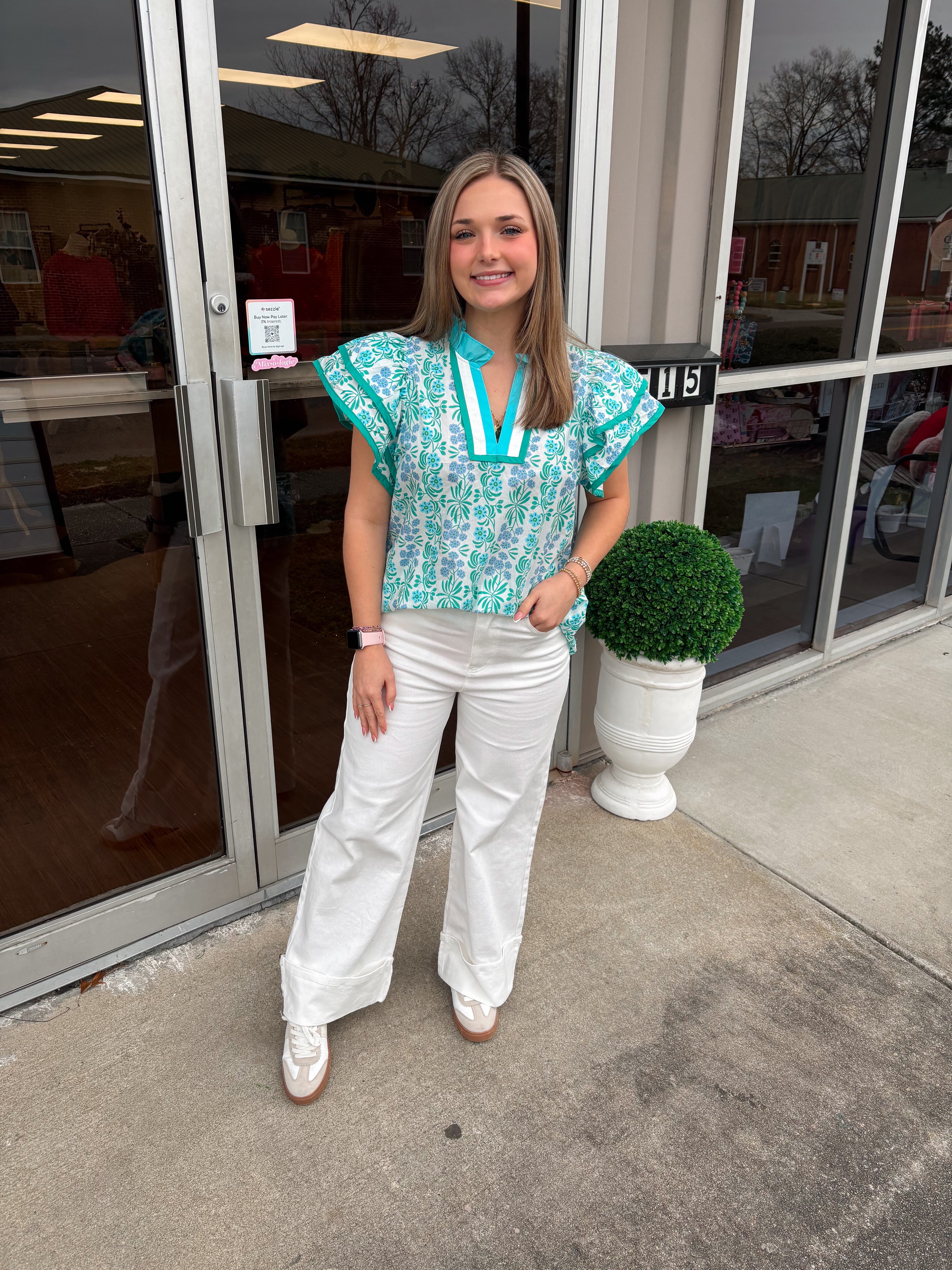 This elegant floral print top enhanced by contrasting stripes for a stylish edge. Feminine flutter sleeves and a flattering neckline create a graceful silhouette. Versatile and comfortable, it pairs effortlessly with shorts, jeans, or skirts, making it perfect for a chic day-to-night look. Elevate your wardrobe with this must-have top that combines comfort and style seamlessly.