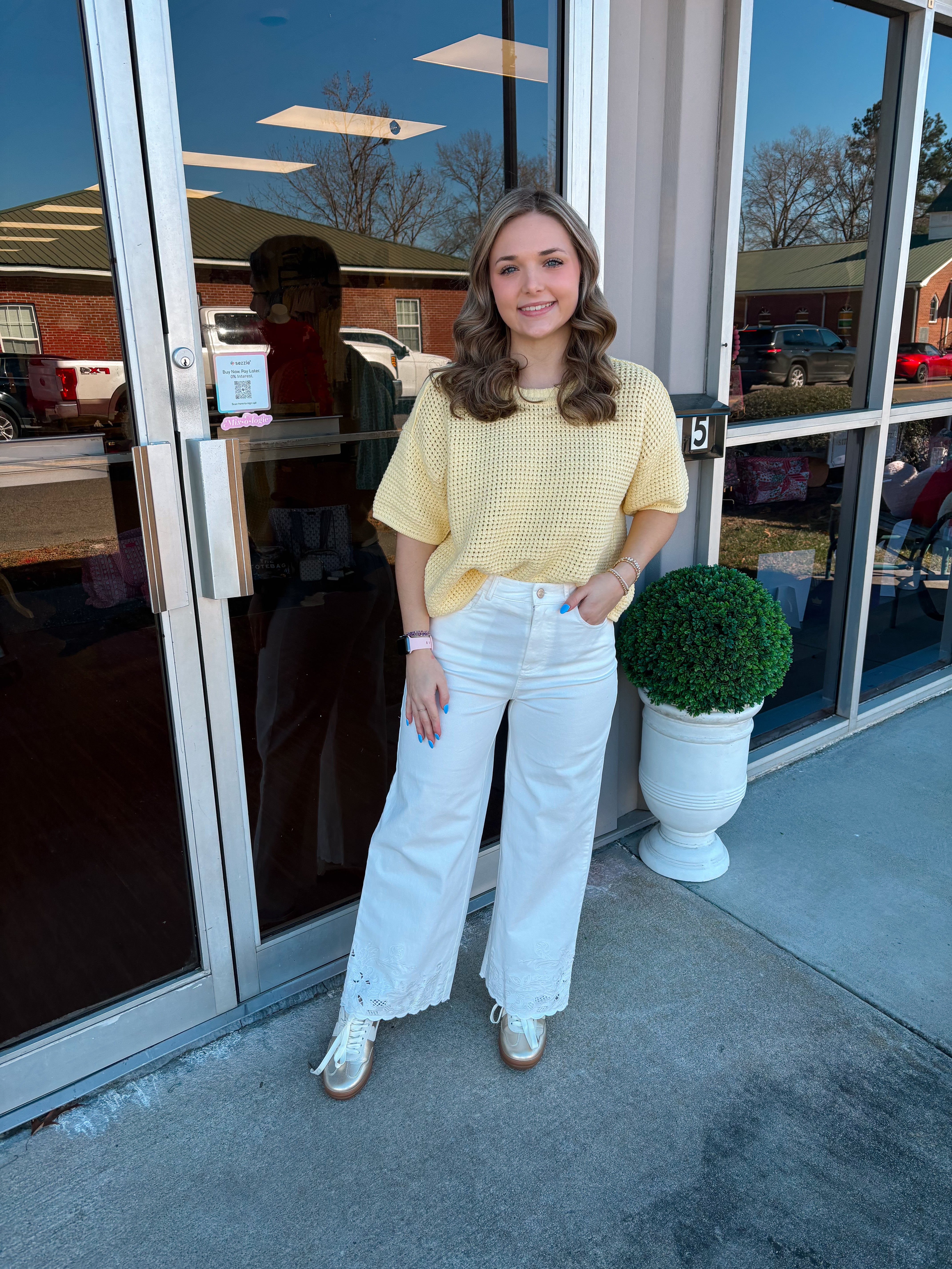 Add a little flair to your outfit with these pants. Featuring playful eyelet and scalloped details, these pants combine style and function with button and zipper closure plus handy front and back pockets to keep your essentials close. Perfect for days when you want to feel polished with a fun twist.