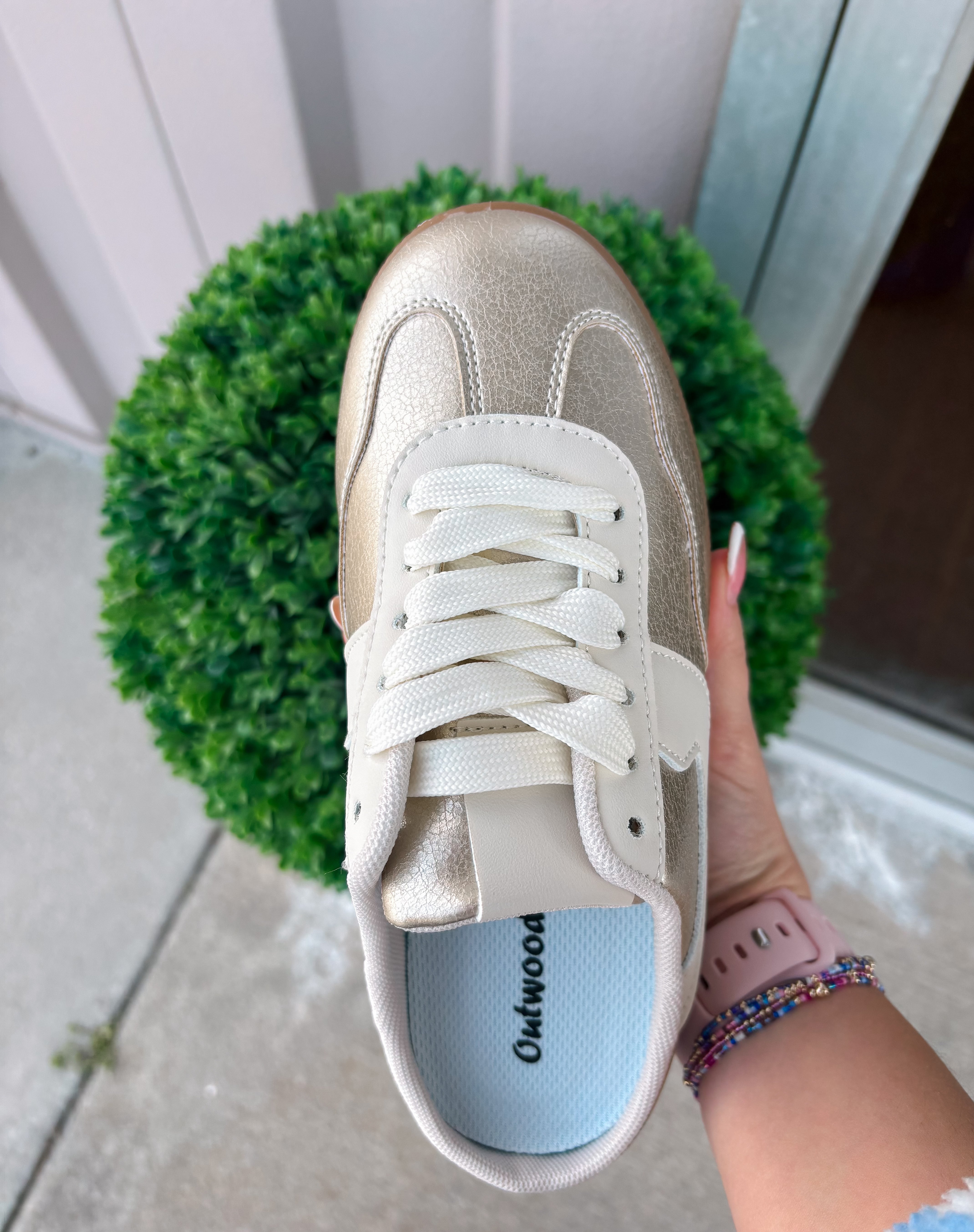 Meet your new everyday go-to with a little bit of shine! It pairs sporty comfort with metallic details, making it easy to dress up your daily denim, dresses, and casual sets. This cutie is a slip-on mule sneaker style with lace up front, cream and soft metallic color way, cushioned footbed for all day comfort, lightweight sole with subtle platform feel. Easy to style for errands, travel, or casual outings. Fits true to size