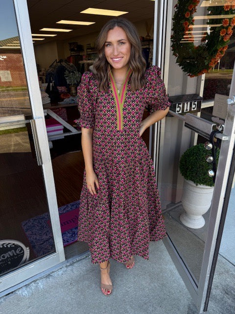 Bold and breezy, this puff sleeve midi dress is made to turn heads. The contrast trim split neckline and smocked collar bring a touch of drama, while smocked cuffs add the perfect finish. Side pockets keep it practical, and the lined, lightweight woven fabric is non-sheer for worry-free wear. An easy choice for everything from brunch to special occasions.
