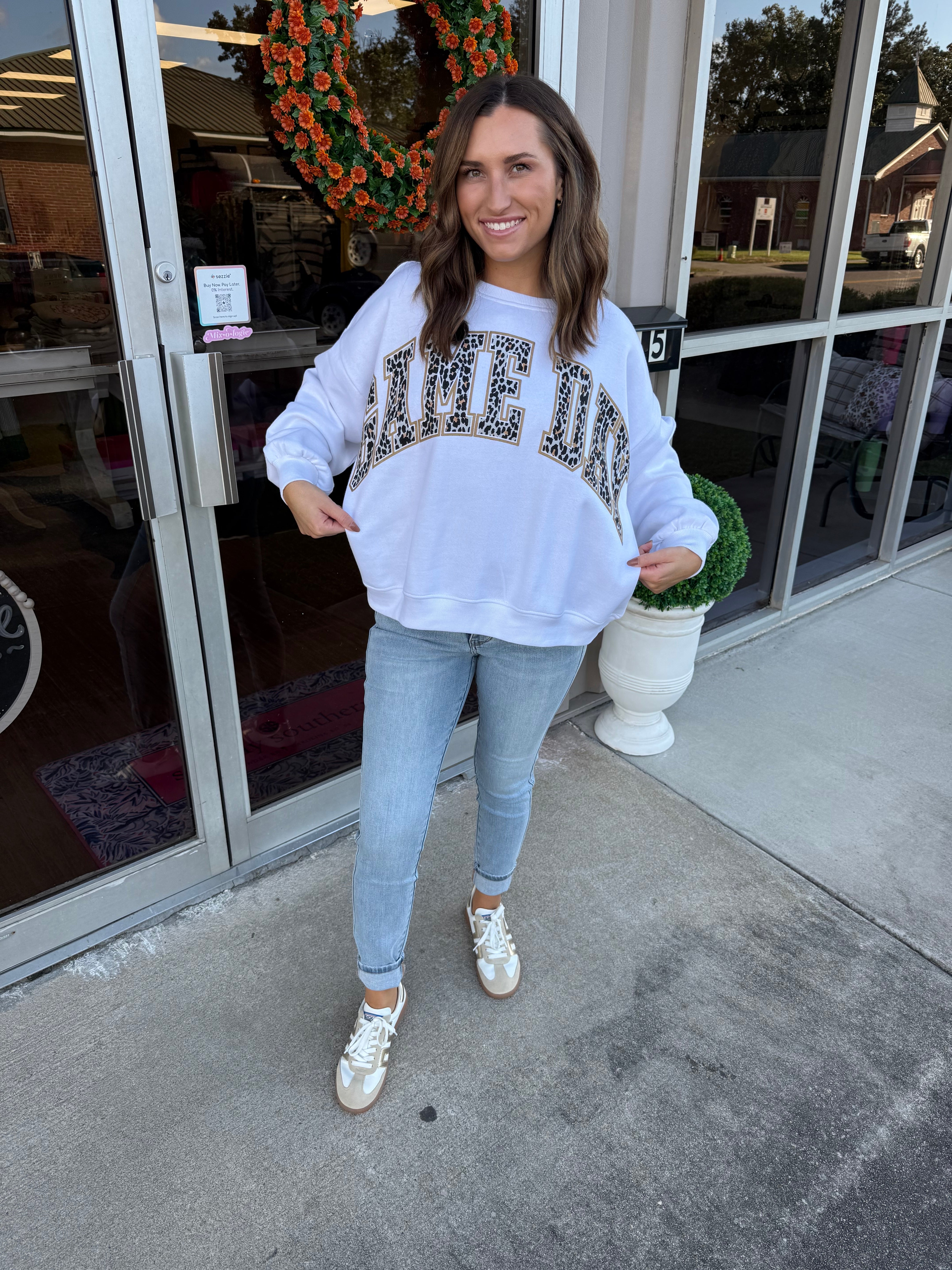 Crafted from a comfortable blend of 55% cotton and 45% polyester, the Game Day Puff Janise Fleece combines warmth with style. Its wide-body, waist-length design covers the belt line on most, offering a flattering fit and ease of layering. The standout 22" leopard print is accented by a metallic gold puff outline, making it an eye-catching choice for game day or casual wear.